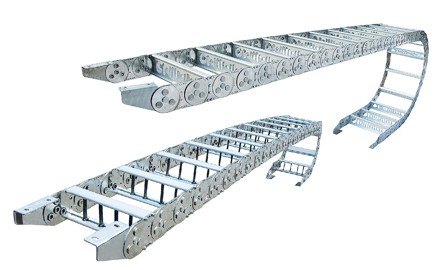 1、可承載數(shù)量多,重量大的電纜及油管,自由懸置(允許不用支承輪)長(zhǎng)度大,支撐板可依顧客需要制作,適用于工作母機(jī),移動(dòng)機(jī)械等。其彎曲半徑為50-600mm,鏈板高度為35-150mm,可任意選用。
