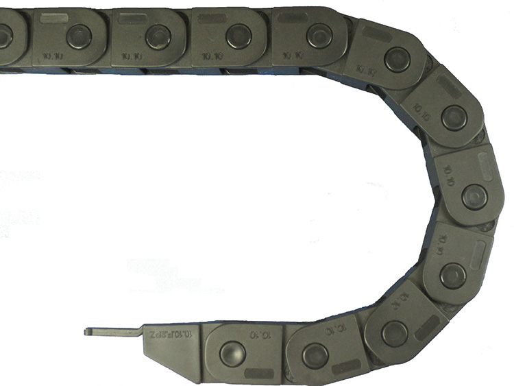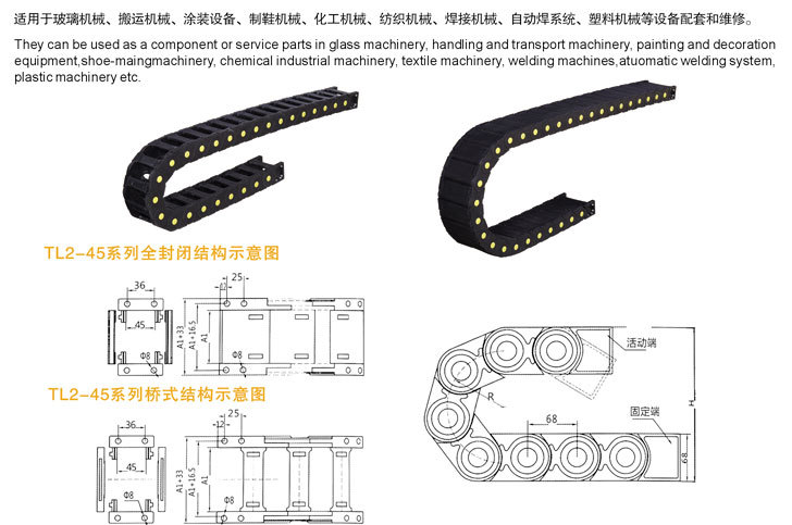單元鏈節(jié)由左右鏈板和上下蓋板組成,尼龍拖鏈每節(jié)都能打開,裝拆方便,不必穿線,打開蓋板后即可把電纜、油管、氣管等放入拖鏈內(nèi)。