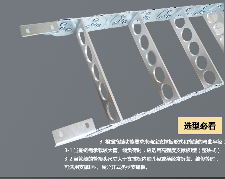 (1)當拖鏈需承載較大管、纜負荷時,應(yīng)選用高強度支撐板Ⅰ型(整塊式)。
