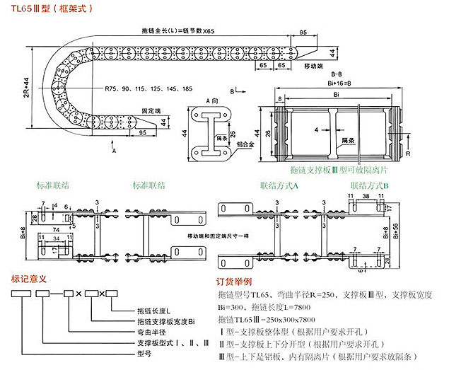 TL65型鋼制拖鏈安裝尺寸:2R+44(R=75/90/115/125/145/180); 拖鏈全長(L)=鏈節(jié)數(shù)x65; 鋁合金:44;拖鏈支撐板:I型整體式和II型上下分開式開孔