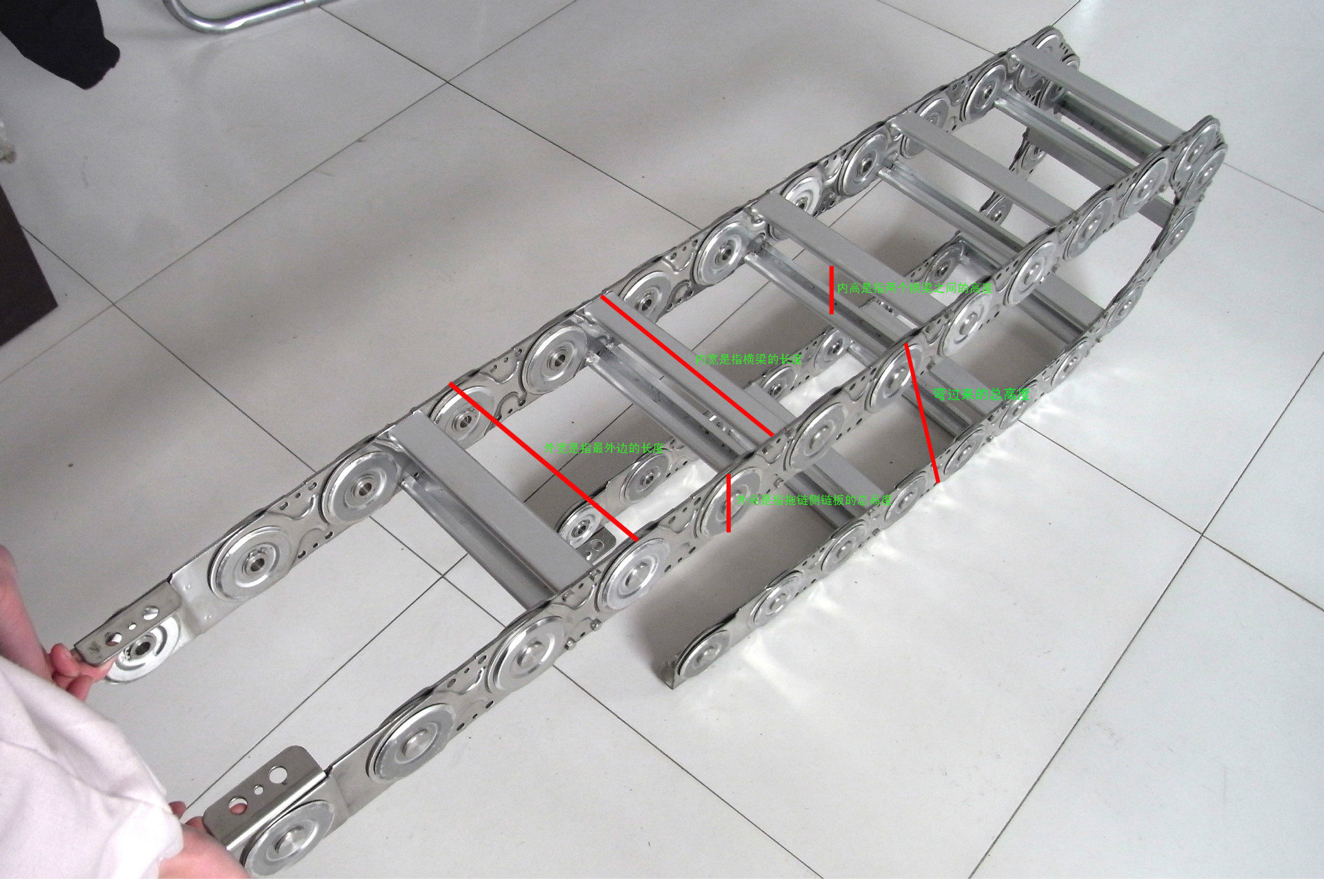 ◆ 內(nèi)寬: 選擇較粗的一些電纜、油管、氣管、水管等,其外徑之和作為拖鏈內(nèi)寬的參考,并留至少10%的寬度空間。