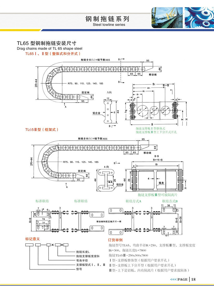 拖鏈型號(hào)TL65,彎曲半徑R=250,支撐板Ⅲ型,支撐板寬度Bi=300,拖鏈長度L=7800