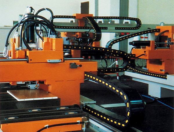 在液晶玻璃的生產(chǎn)過程中會有機(jī)械手轉(zhuǎn)彎180°來進(jìn)行取放玻璃,而由于拖鏈一般只在豎直拖鏈盤里進(jìn)行豎直往復(fù)運(yùn)動,若機(jī)械手轉(zhuǎn)彎180°的話,則拖鏈在豎直拖鏈盤里無法轉(zhuǎn)彎運(yùn)行。目前采用的是拖鏈盤由豎直狀改成圓弧狀,當(dāng)機(jī)械手進(jìn)行180°轉(zhuǎn)彎時(shí),拖鏈會沿著拖鏈盤圓弧的軌跡進(jìn)行循環(huán)往復(fù)運(yùn)動,此種結(jié)構(gòu)不僅解決了設(shè)備運(yùn)行方向的單一性,而且使設(shè)備運(yùn)行于不同方向的靈活性更高。