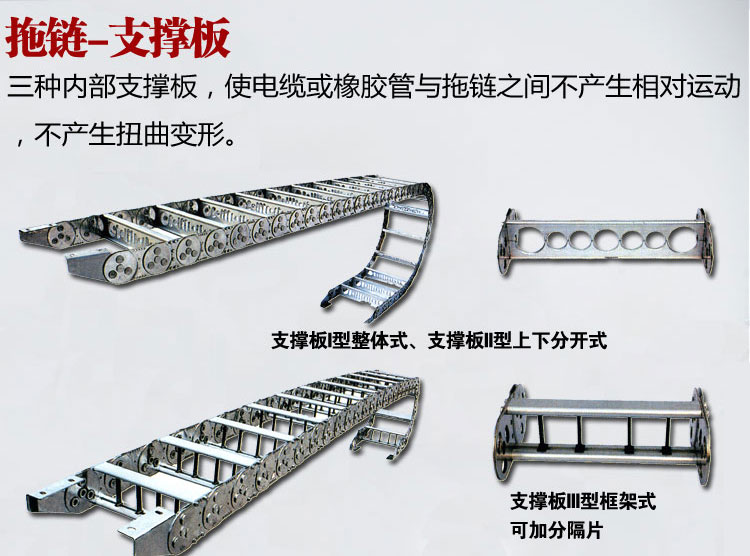 1、可承載數(shù)量多,重量大的電纜及油管,自由懸置(允許不用支承輪)長(zhǎng)度大,支撐板可依顧客需要制作,適用于工作母機(jī),移動(dòng)機(jī)械等。其彎曲半徑為50-600mm,鏈板高度為35-150mm,可任意選用。