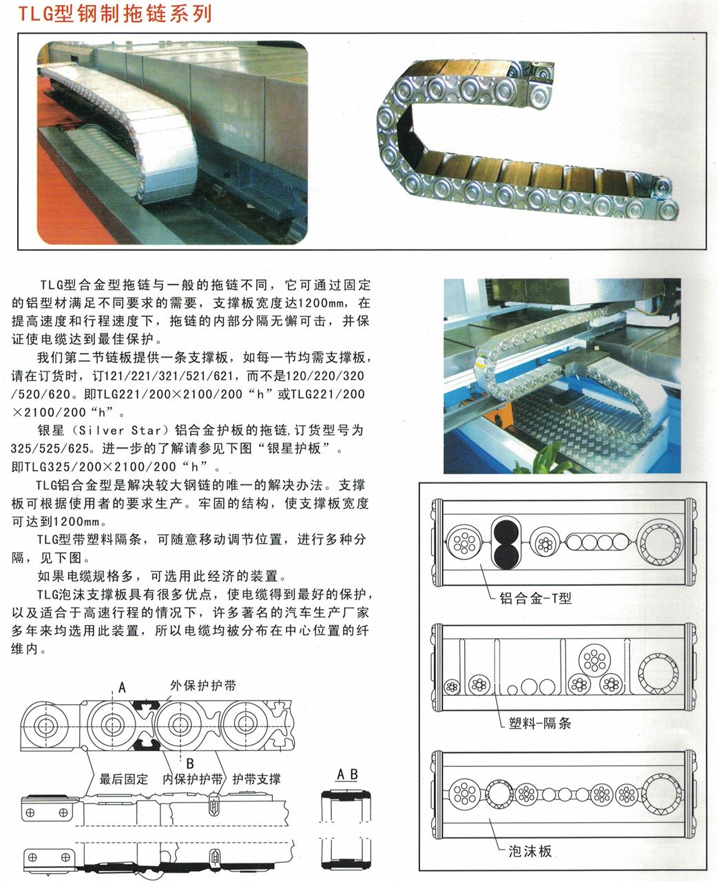 TL系列拖鏈的主體是由鏈板(優(yōu)質(zhì)鋼板鍍鉻)、支撐板(擠拉鋁合金)、軸銷(合金鋼)等部件組成,