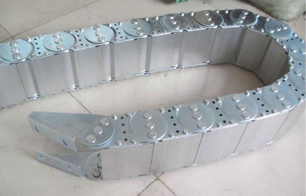 冷軋鋼和不銹鋼。拖鏈的型號(hào)、拖鏈的總寬、拖鏈的長、支撐板的型式、支撐板內(nèi)置孔的大小、拖鏈的彎曲半徑